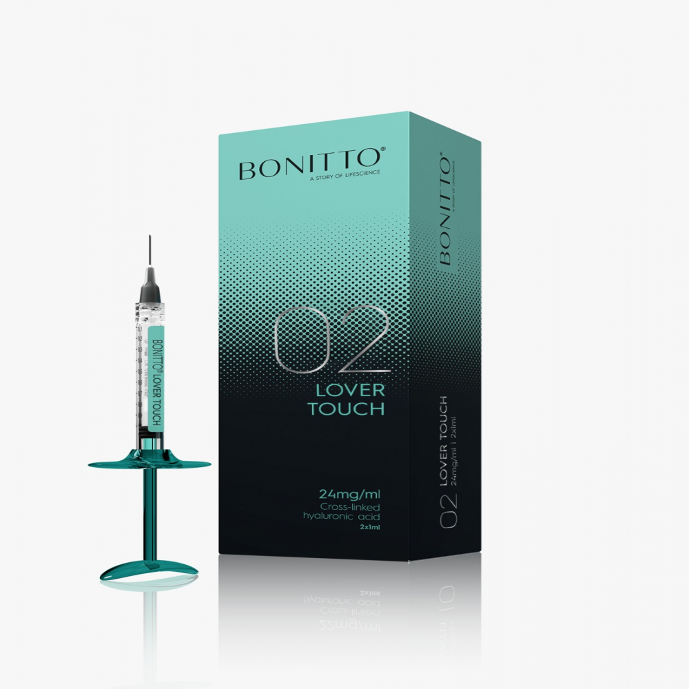 BONITTO® 02 LOVER TOUCH 24 mg/ml is a biodegradable crosslinked hyaluronic acid hydrogel resorbed over time, intended to be injected in the mid to deep dermis to restore lost volume of the soft tissue. BDDE-crosslinked hyaluronic acid hydrogel 24 mg/ml when injected in the mid to deep dermis, adds temporarily volume to thinned soft tissues of the face.