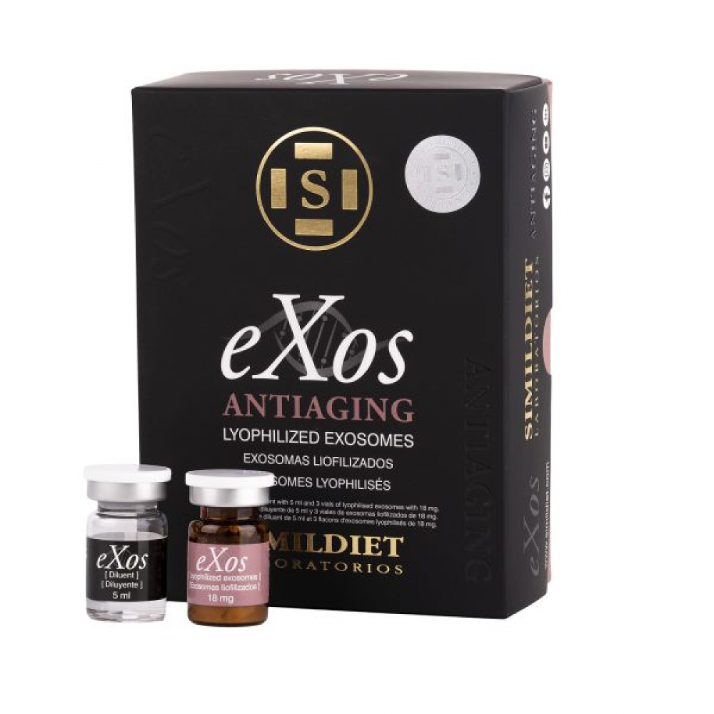 Box with 3 vials x 5 ml of diluent and 3 vials x 18 mg of lyophilized exosomes.